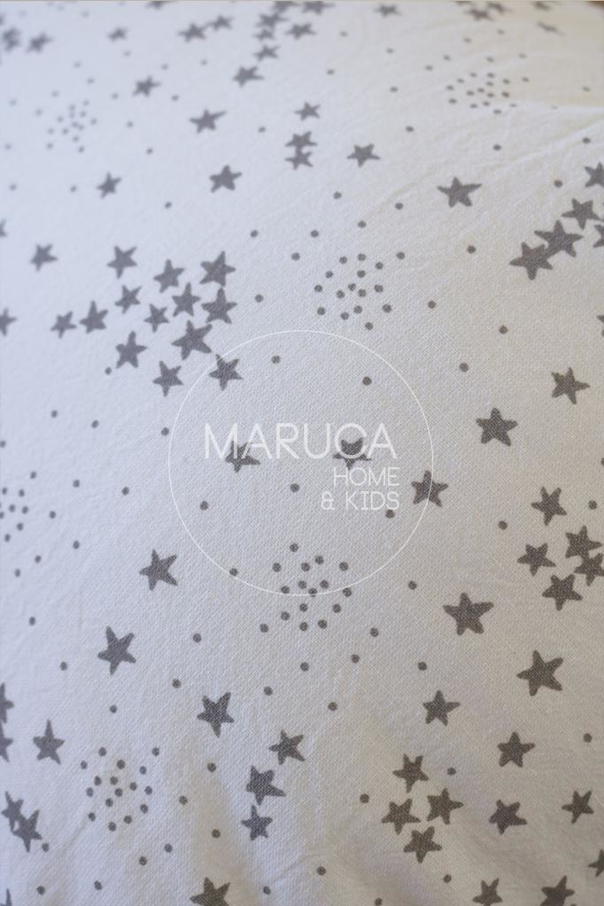 Este almohadón esta realizado con estampa de estrellitas   gris sobre off white.