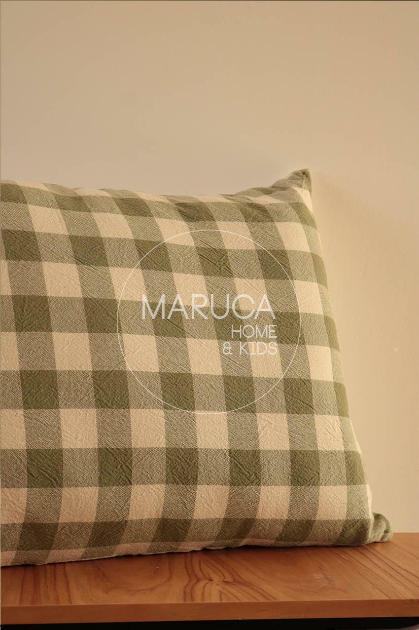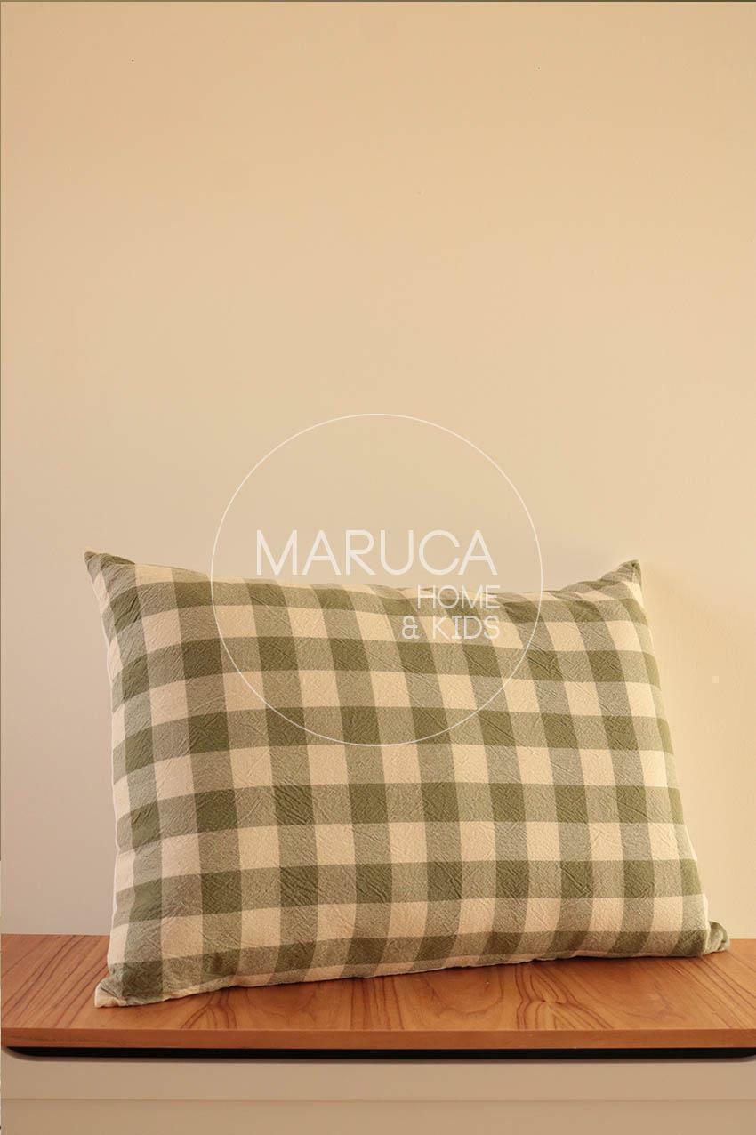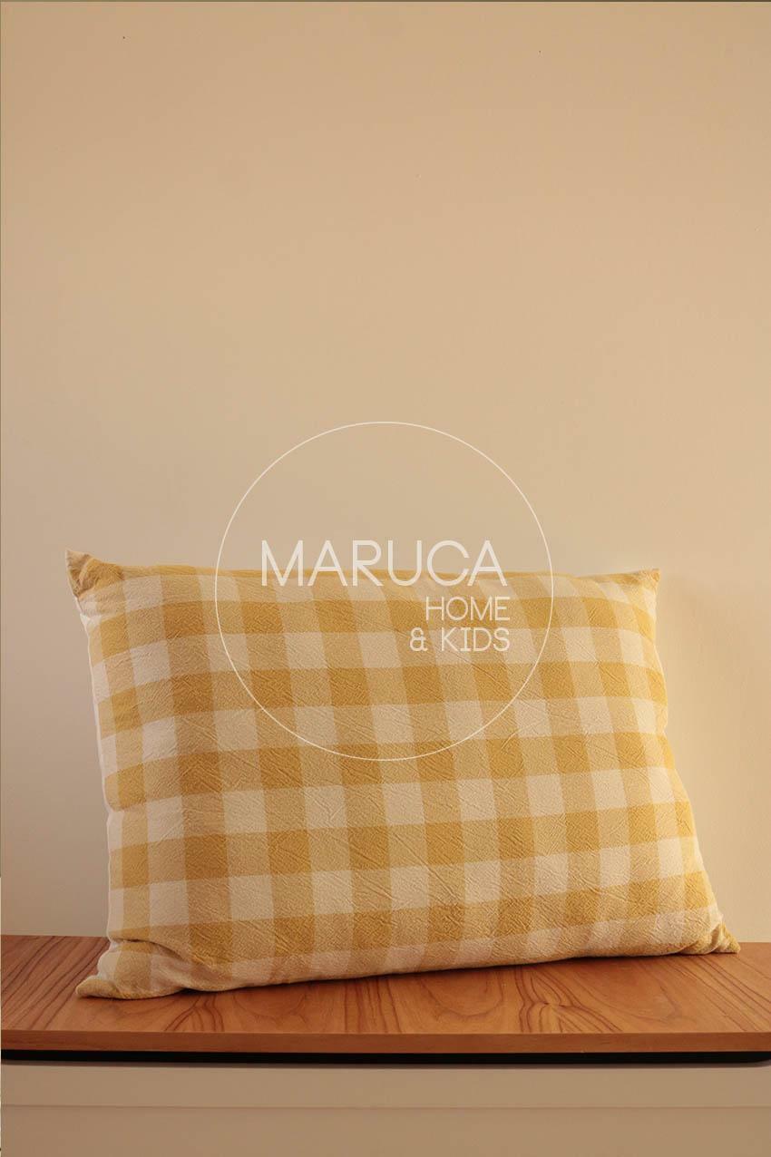 Almohadón íntegramente confeccionado en 100% algodón. Frente a cuadros de color, crudo liso en el dorso.