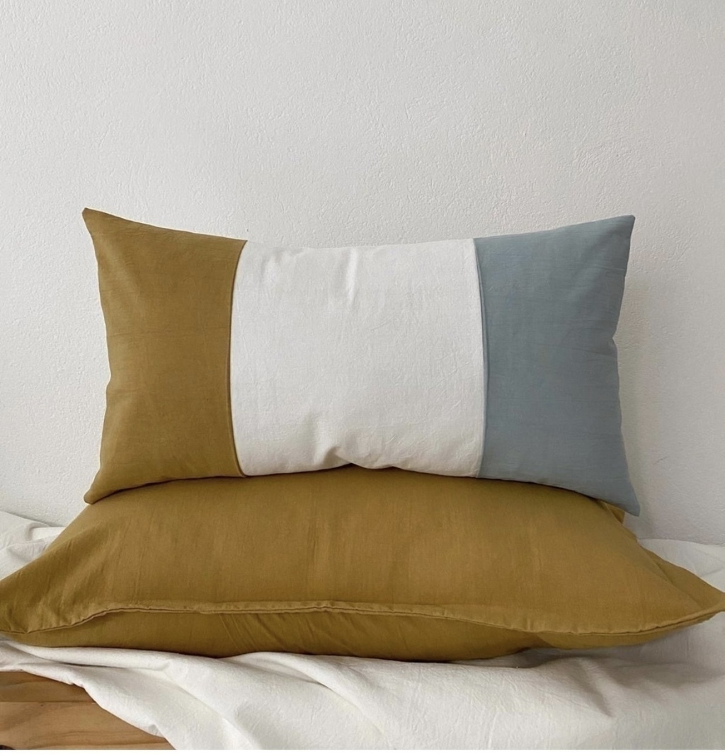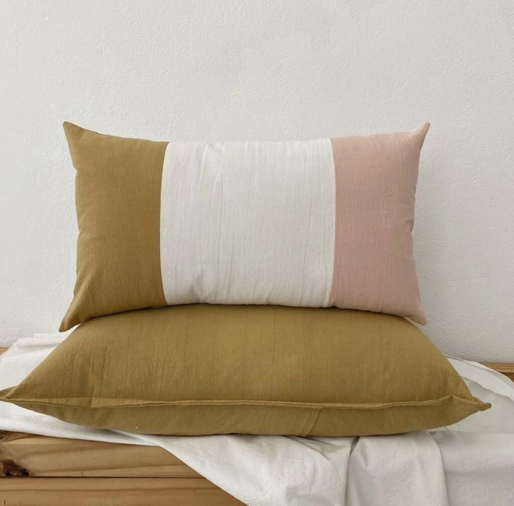 Almohadón realizado en tussor natural de base, con otros dos colores del mismo genero.