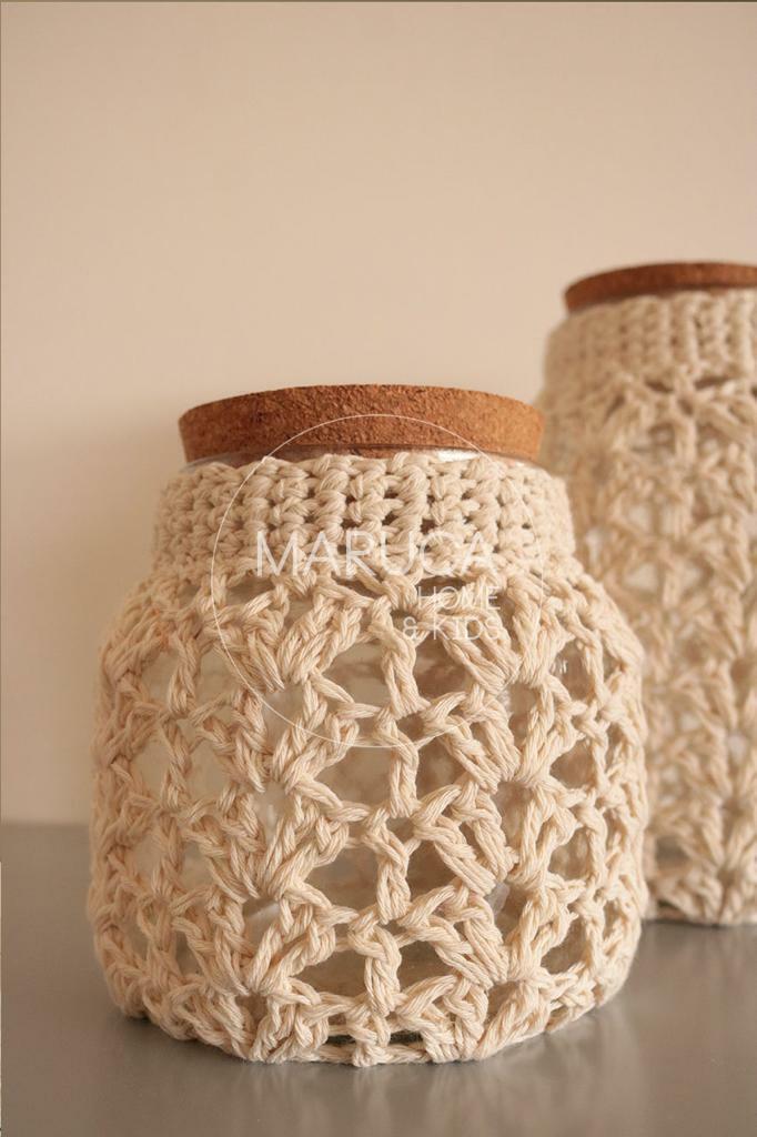 Frasco vidrio tejido a crochet con tapa de corcho.